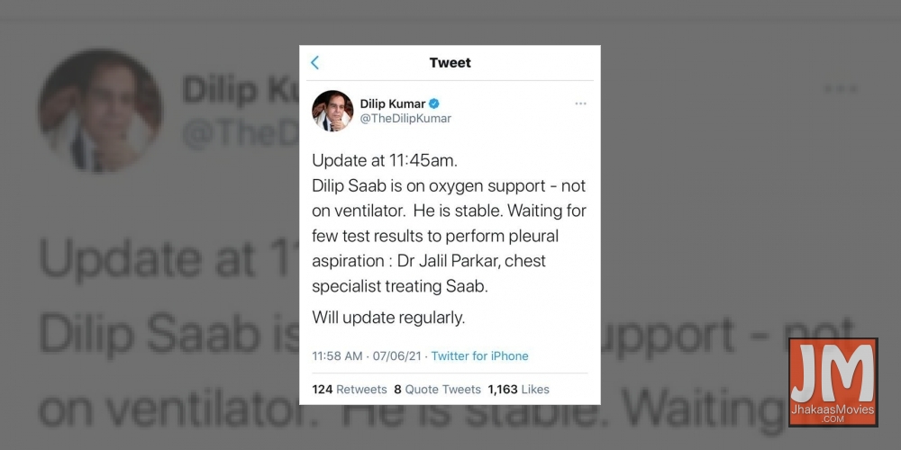 "Update at 11.45 a.m., Dilip Saab is on oxygen support -- not on ventilator. He is stable. Waiting for few test results to perform pleural aspiration : Dr Jalil Parkar, chest specialist treating Saab. Will update regularly," the tweet read.
