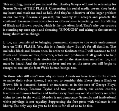 Showrunner Eric Wallace also tweeted: "This morning, many of you learned that Hartley Sawyer will not be returning for season seven of ‘The Flash'. Concerning his social media tweets, they broke my heart and made me mad as hell. And they're indicative of the larger problem in our country."