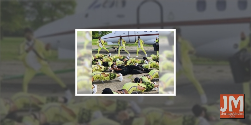 Pulkit posted a picture from a set on Instagram. In the image, Pulkit along with several other dancers is seen lying on a runway and an aeroplane can be seen in the background.